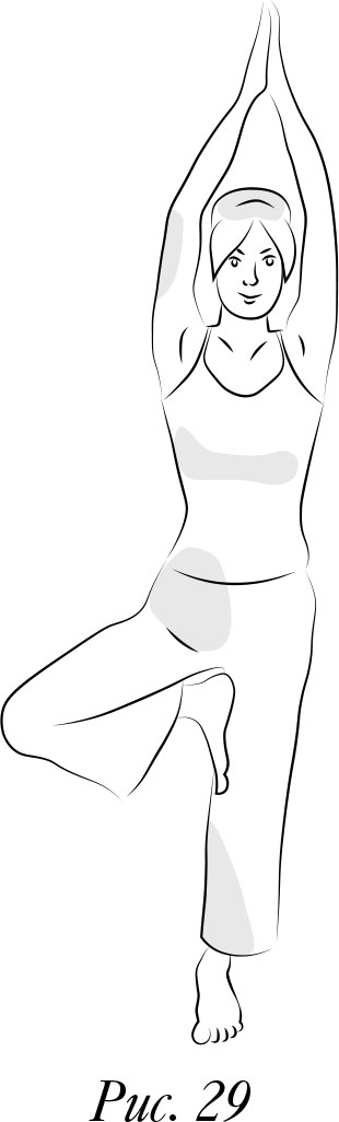 Потом опустите правую ногу, снова закройте глаза и послушайте свое тело. Настраивайтесь на чувство равновесия, ощущайте его, замечайте каждый сигнал, который посылает вам ваше тело… Теперь прижмите стопу левой ноги к внутренней поверхности правого бедра. В стойке на одной левой ноге несколько секунд старайтесь удержать равновесие. Опустите ногу.