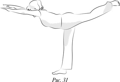 Как только вы почувствуете баланс, медленно отведите левую ногу назад и одновременно наклонитесь вперед… Левая нога и корпус тела вместе с вытянутыми руками должны стать параллельными полу. Следите за дыханием, старайтесь держать равновесие.