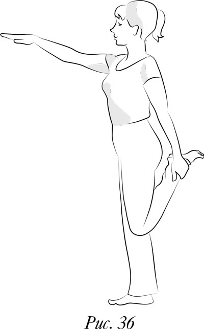 Соедините ноги, руки вытяните перед собой ладонями вниз. Согните левую ногу в колене, потянитесь назад левой рукой и обхватите левую лодыжку. Прогибаясь в талии, рукой тяните левую ногу насколько возможно вверх. Правая рука вытянута вперед параллельно полу. Вы должны почувствовать натяжение мышц бедра. Если не удается сохранить равновесие, держитесь за что-нибудь правой рукой, пока не станете устойчивы. Удерживайте положение секунд десять, потом отпустите левую ногу и поставьте ее на пол.