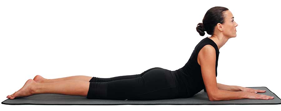 Осваивайте бхуджангасану с ардха бхуджангасаны (позы сфинкса), в которой прогиб позвоночника выражен минимально. Исходное положение: лежа на животе. Расположите предплечья на полу таким образом, чтобы локти находились четко под плечевыми суставами.