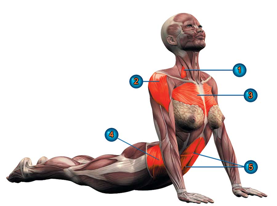 Растягиваются: 1 – лестничные мышцы, 3 – большая грудная мышца; 4 – наружная и внутренняя косые мышцы живота, 5 – прямая мышца живота; работает: 2 – дельтовидная мышца