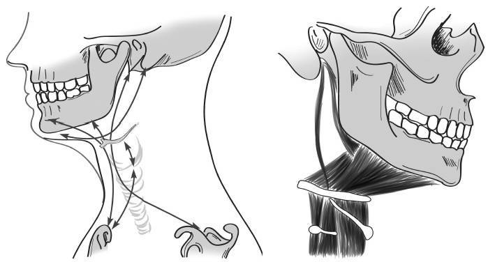 Под внешним видом подобных деформаций всегда скрывается мышечно-фасциальный дисбаланс мышц шеи, главным образом тех, что держат подъязычную кость (рис. 17).