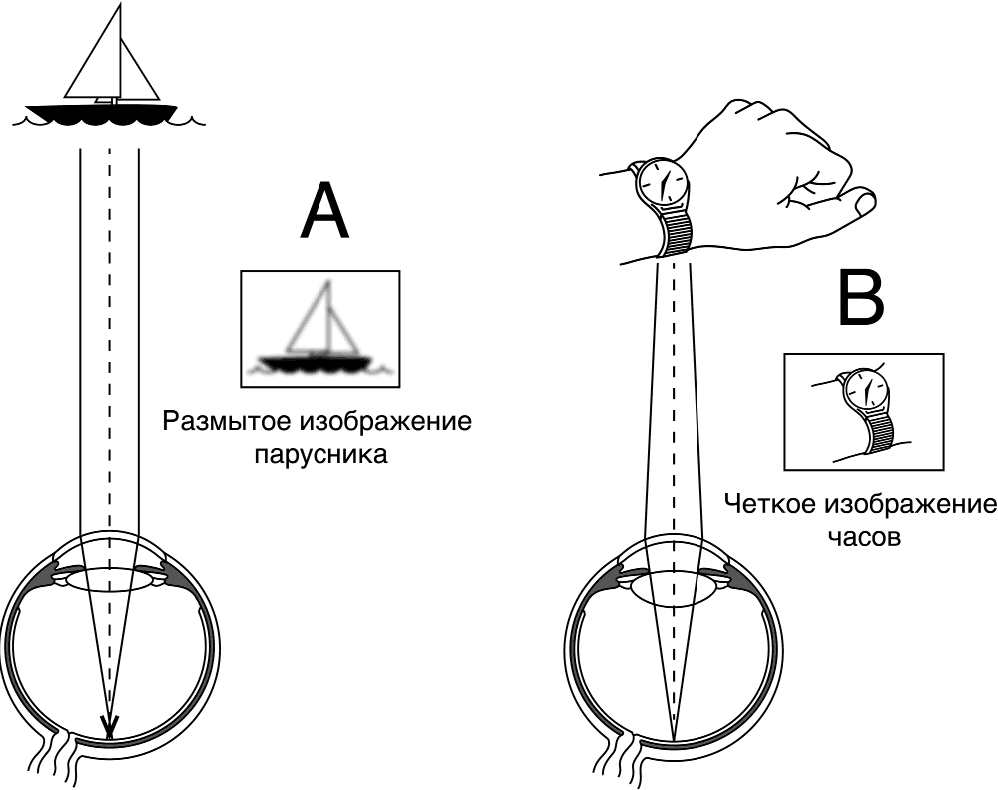 Изображение А. Изображение удаленного объекта фокусируется перед сетчаткой.