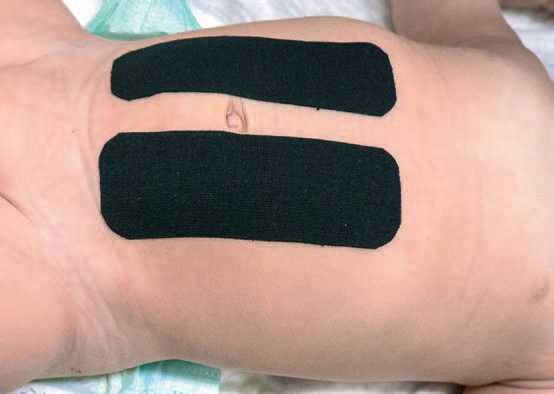 Обратите внимание. Тейпинг области живота и спины выполняется согласно 5-му варианту техники тейпирования (см. главу «Техники тейпирования в лечебной практике»). При этом натяжение всех тейпов проводится с 0 % или 5 %-ной степенью, максимум 10 %-ной степенью. 10 %-ная степень используется редко, иногда у взрослых, так как может привести к ненужной стимуляции, особенно в условиях повышенного мышечного тонуса центрального генеза и применения тейпов III, IV типа. У маленьких детей ширину тейпа часто уменьшают до 3–4 клеток (3–3,5-4,0 см). Это касается только тейпов, накладываемых на живот и спину. Y-образный тейп на шею по ширине не уменьшается (рис. 3–5).