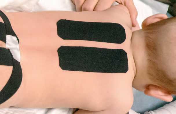 Область спины: тейпирование проводится от уровня Th12 до Th3-C7. Данная разница (Th3-C7) обусловлена невозможностью проведения тейпинга до уровня С7 вследствие имеющейся картины неврологического тонуса и/или выраженного сопротивления ребенка. Однако это никаким образом не снижает эффективность самого тейпинга.