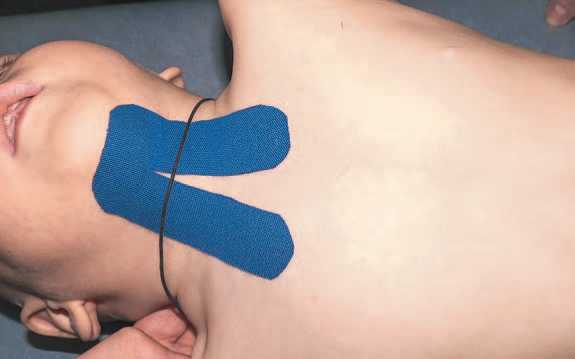 Давайте остановимся отдельно на варианте, показанном на рис. 5. Дело в том, что он особенно эффективен. Мы начали применять только этот вариант намного раньше всей описанной схемы. Было предположено, что минимальная стимуляция рецепторного аппарата кожных покровов, подкожножировой клетчатки, фасции передней поверхности шеи приведет к включению функции центрирования головы и шейного отдела, основанной на активации аутохтонной мускулатуры на фоне изменения рецепции. Эффективность первичного применения была выше ожидаемой. Все родители с сильным удивлением и отчасти каким-то недоверием рассказывали, как после первого же тейпинга ребенок, который не держал голову с рождения (эффект не зависит от возраста), имел выраженный симметричный шейно-тонический рефлекс (СШТР), начинал удерживать голову, интересоваться происходящим вокруг и с этой целью постоянно пытался центрироваться. Впоследствии центрирование головы очень быстро закреплялось.