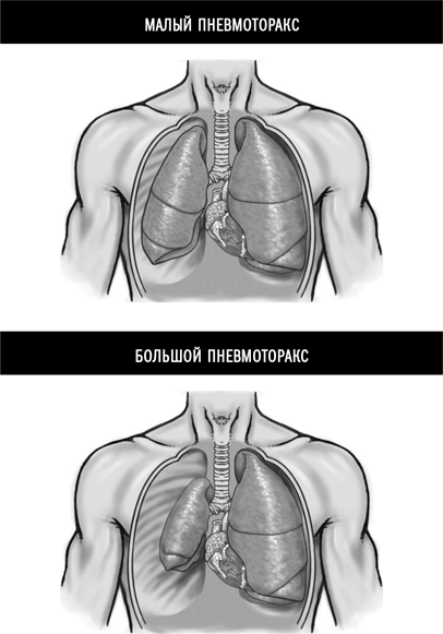 Пневмоторакс может возникнуть и без внешней раны. Такой пневмоторакс называется закрытым. Его может спровоцировать повреждение (например, перелом ребра). Но он возникает и спонтанно, как это произошло с медсестрой. Обычно человек может жить с закрытым пневмотораксом, пока все не заживет, если только тот не перейдет в клапанный пневмоторакс{142}.