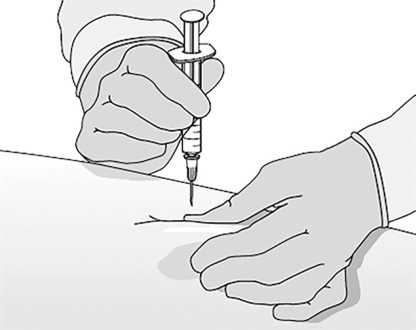 Возьмите шприц в правую руку и введите в кожу инъекционную иглу срезом вверх под углом 10–15 градусов на глубину среза иглы.