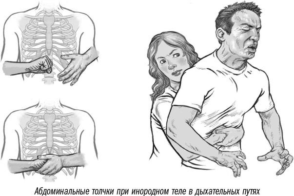Если он снова кивнет, выполните абдоминальные толчки. (Их еще называют «приемом Геймлиха».) Для этого зайдите за спину пострадавшего и обхватите руками верхнюю часть его живота. Одну руку сожмите в кулак и положите той стороной, где большой палец, на живот пострадавшего, чуть ниже грудины. Другую руку поставьте поверх кулака. Наклоните пострадавшего слегка вперед, толкая его грудью.