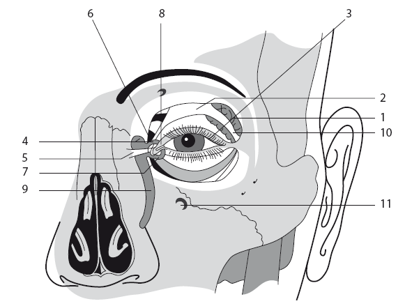 1 — слезная железа; 2 — сухожилие мышцы, поднимающей верхнее веко; 3 — верхнее веко, хрящевая пластинка; 4 — слезный мешок; 5 — срединная связка века; 6 — верхний слезный каналец; 7 — нижний слезный каналец; 8 — слезный сосочек и слезная точка; 9 — слезный проток; 10 — боковое прикрепление сухожилия мышцы, поднимающей веко; 11 — подглазничное отверстие