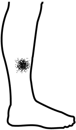 Трофические язвы при хронической венозной недостаточности располагаются, как правило, на внутренней поверхности нижней трети голени в проекции перфорантных вен (рис. 3.6).