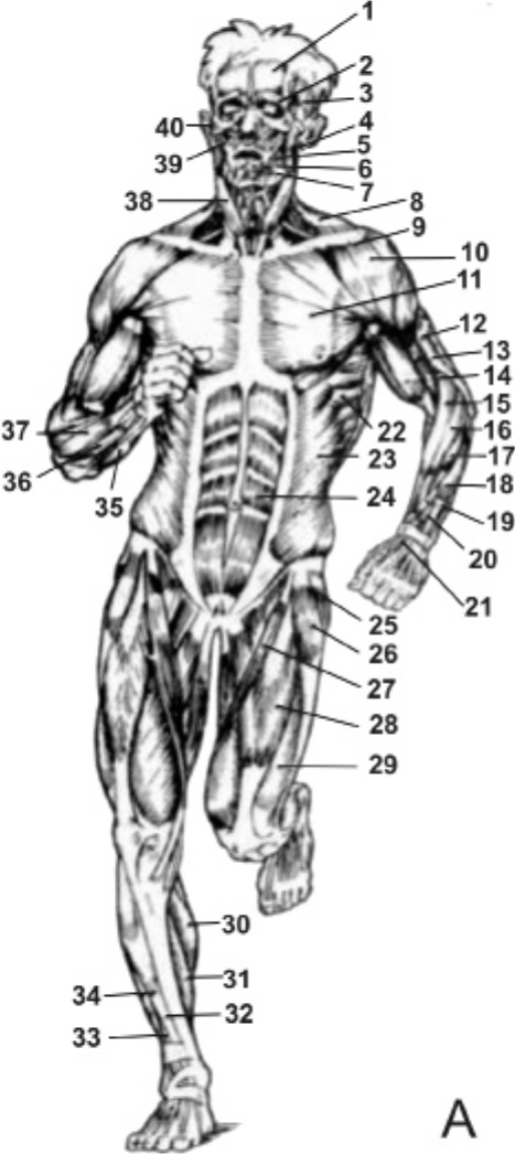 А – вид спереди: 1 – лобное брюшко (надчерепной мышцы); 2 – круговая м. глаза; 3 – височная м.; 4 – собственно жевательная м; 5 – щечная м.; 6 – круговая м. рта; 7 – м. – опускатель угла рта; 8 – трапециевидная м.; 9 – подключичная ямка; 10 – дельтовидная м.; 11 – большая грудная м.; 12– трехглавая м. плеча; 13 – плечевая м.; 14 – двуглавая м. плеча; 15 – плечелучевая м.; 16 – длинный лучевой разгибатель запястья; 17 – короткий лучевой разгибатель запястья; 18 – разгибатель пальцев; 19 – короткий разгибатель большого пальца; 20 – длинная отводящая м. большого пальца кисти; 21 – длинный разгибатель большого пальца; 22 – передняя зубчатая м.; 23 – наружная косая м. живота: 24 – прямая м. живота; 25 – средняя ягодичная м.; 26 – мышца-натягиватель широкой фасции: 27 – портняжная м.; 28 – прямая м. бедра; 29 – наружная широкая м. бедра; 30 – икроножная м.; 31 – камбаловидная м.; 32 – передняя большеберцовая м.; 33 – длинный разгибатель большого пальца; 34 – длинный разгибатель пальцев; 35 – локтевой сгибатель запястья; 36 – локтевой разгибатель запястья; 37 – разгибатель пальцев; 38 – грудино-ключично-сосцевидная м.; 39 – большая и малая скуловые м. м.; 40 – м. подниматель верхней губы и крыла носа.