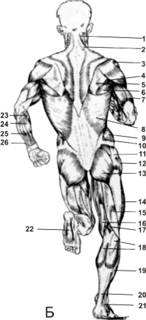 Б – вид сзади: 1 – грудино-ключичнососцевидная м.; 2 – трапециевидная м.; 3 – дельтовидная м.; 4 – малая круглая м.; 5 – подлопаточная м.; 6 – большая круглая м.; 7 – трехглавая м. плеча; 8 – широчайшая м. спины; 9 – наружная косая м. живота; 10 – поясничный треугольник; 11 – средняя ягодичная м.; 12 – мышца-натягиватель широкой фасции; 13 – большая ягодичная м.; 14 – наружная широкая м. бедра; 15 – двуглавая м. бедра; 16 – полусухожильная м.; 17 – полуперепончатая м.; 18 – икроножная м.; 19 – камбаловидная м; 20 – пяточное сухожилие; 21 – длинная малоберцовая м.; 22 – короткий сгибатель пальцев; 23 – плечелучевая м.; 24 – лучевой сгибатель запястья; 25 – длинная ладонная м.; 26 – локтевой сгибатель запястья.