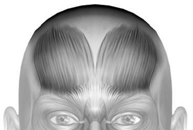 Например, горизонтальные морщины на лбу (рис. 3) образуются из-за спазма (укорочения) лобной мышцы (рис. 4). Представить, как это происходит, можно на примере работы всем известной римской шторы. Морщины на лбу – это те же складки из ткани, которые собираются при поднятии (укорочении) шторы (рис. 5).