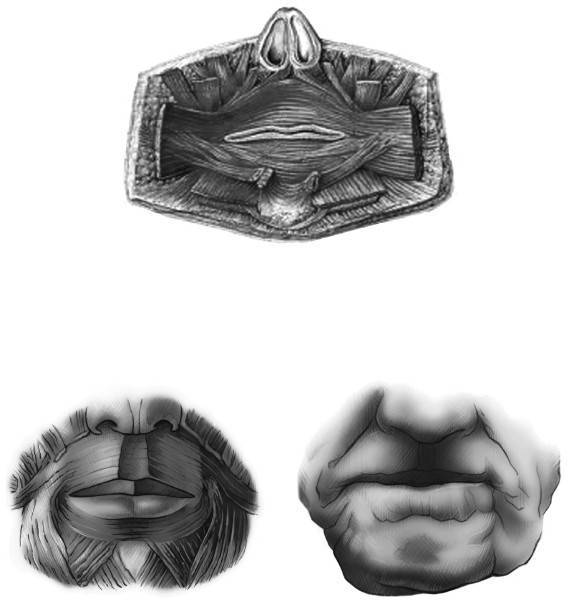 Обычно усыхание круговой мышцы рта приводит к западанию рта внутрь, к истончению слизистой губ.