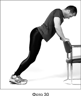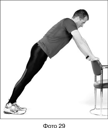 2. Обеими ногами поочередно сделайте большой шаг назад, в итоге они снова должны оказаться на ширине плеч. Упритесь пятками в пол, колени не сгибайте, наклонитесь к стулу или стене (см. фото 29). Вы почувствуете, как внизу ног растягивается икроножная мышца.