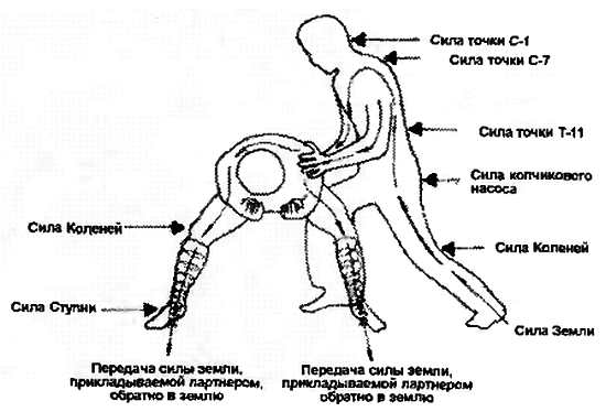 Толчки в область спины приводят к общему укреплению позвоночного столба, мизинцев рук и пятых пальцев ног, а также фасции мышц спины. Встаньте в позицию Ян. Убедитесь, что усилие больших и пятых пальцев ноги направлено вниз и почувствуйте, как сила поступает в мизинцы рук и пятые пальцы ног. Сохраняйте положение тела в момент, когда партнер толкает вас в спину (рис. 3-91б).