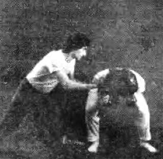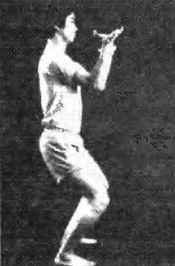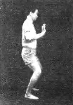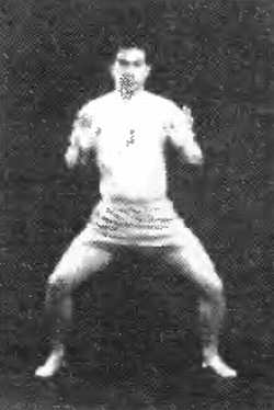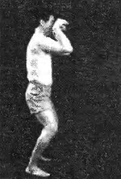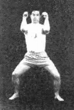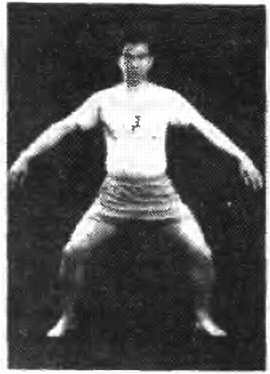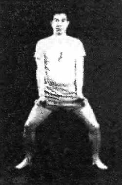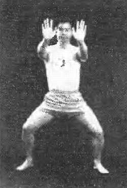 Исходное положение — Поза Всадника; расстояние между ступнями — стандартное, как указано выше. Пальцы ног несколько развернуты внутрь, колени разведены и зафиксированы, как в позе Обхватывания Дерева (рис. 3-84).