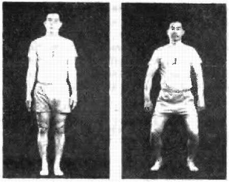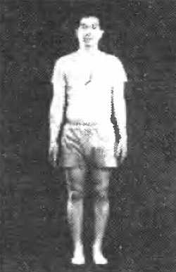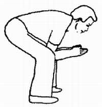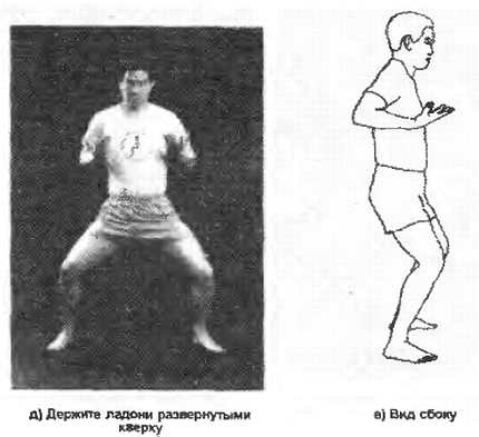 1. Встаньте прямо, выпрямив ноги в коленях; ступни расположены на расстоянии 35 см одна от другой. Начинающим лучше располагать ступни так, чтобы вторые пальцы ног были направлены прямо вперед. Разворот стопы наружу приводит к возникновению нежелательного сдавливания в пояснично-крестцовом отделе позвоночника, несмотря на правильную фиксацию коленей и сжатие верхней части бедер и ягодиц. Большой и указательный пальцы рук сомкнуты, остальные пальцы сведены вместе. Руки должны быть прямыми, немного опущенными в плечах и находиться немного впереди тела.