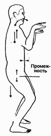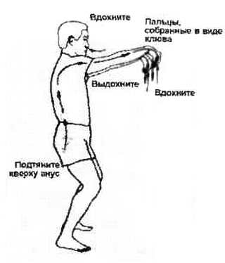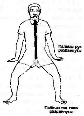 д. Сделав выдох, расслабьте область промежности и заднего прохода и опустите руки, одновременно напрягая и фиксируя локтевые и коленные суставы. В момент, когда руки полностью опущены вниз, а запястья сохраняют изогнутое положение, разверните руки кнаружи относительно боковых поверхностей бедер и как можно шире разведите пальцы рук и ног. С силой уперев кончик языка в небо, подтяните кверху анус и наружные половые органы.