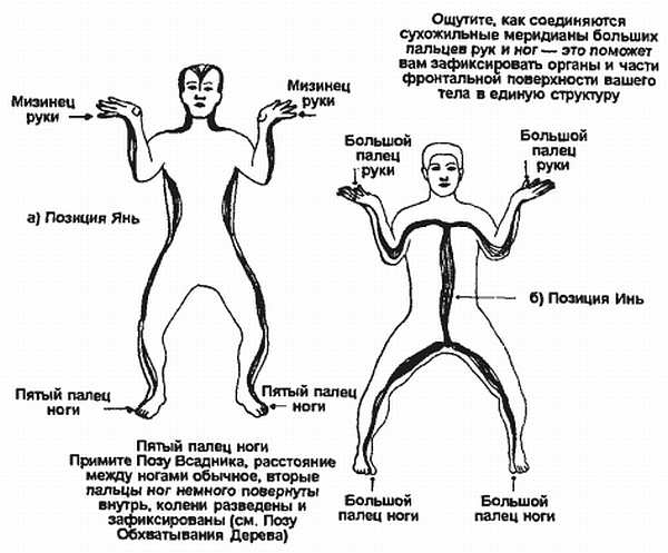 При правильном использовании сухожильных меридианов сохранение положения тела потребует значительно меньших усилий. Поэтому, находясь в позиции Ян, обращайте внимание на ощущение поддержки структуры вашего тела, возникающее благодаря функционированию соединенных в единый меридиан сухожилий.