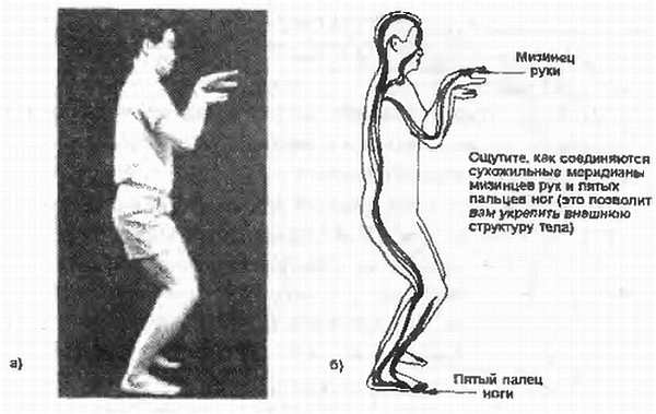1. Встаньте в исходное положение; ноги — на расстоянии, равном длине голени. Опустите локти, руки держите раскрытыми на уровне плеч; ладони направлены вниз. Зафиксируйте запястные суставы, поддерживая угол 45 градусов между линией кисти и предплечья. Вытяните мизинцы рук так, чтобы ощущать в них циркуляцию энергии Ци. Почувствуйте энергетическую связь между мизинцами рук и пятыми пальцами ног (мышечно-сухожильный меридиан берет начало в мизинцах, подымается вверх по предплечьям к боковым поверхностям головы, затем опускается за ушами по внешней поверхности предплечий и через лопатки, копчик и наружную поверхность бедер подходит к пятым пальцам ног).