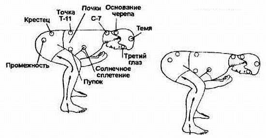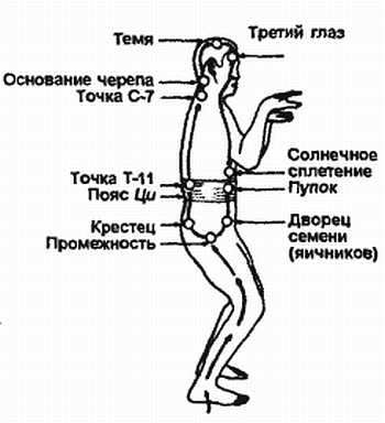 5. Сделав вдох, упакуйте Ци в области точки Т-11; при этом необходимо выгибать, выпячивать зону точки Т-11 наружу, пока не почувствуете, что позвоночный столб выгнулся, подобно натянутому луку (при выпячивании точки Т-11 в качестве опоры можно использовать стену, ощущая, как точка упирается в нее). Ощущение натянутого лука в позвоночнике достигается за счет того, что точка Т-11 в момент выпячивания создает дополнительное напряжение на линии, соединяющей ее с точкой С-7. Направив поток Ци в область спины, сожмите мышечное кольцо ануса, подтягивая вверх урогенитальную диафрагму. При этом почувствуйте, как энергия из активных точек К-1 на подошве стопы поднимается в зону точки Т-11. Ощутите, что в районе точки Т-11 возникает широкая полоса (Пояс Ци), проходящая через центр Враг Жизни в район пупка и нижнего отдела брюшной полости.