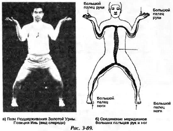 Данная поза предназначена для укрепления мизинцев и больших пальцев рук. Поза Поддерживания Золотой Урны помогает соединить мизинцы с пятыми пальцами ступней линией, проходящей за ушами (в месте расположения одной из двух наибольших костей черепа) и опускающейся вдоль боков вниз, к ногам (рис. 3-83а). Кроме того, она укрепляет меридианную линию большого пальца руки, присоединяя его через кости черепа, грудину и пупок к большим пальцам ног (рис 3-83б). Обе эти меридианные линии играют важную роль в соединении костной структуры с мышечными сухожилиями. При указанном соединении оба сухожильных массива сообщают силу боковым и фронтальной поверхностям тела. Сама поза подразделяется на два положения: Положение Ян и Положение Инь.