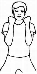 в. Сделайте выдох, с усилием раздвигая руки в стороны на уровне плечевого пояса и фиксируя при этом область промежности и ануса. Запястья должны быть изогнуты и напряжены.