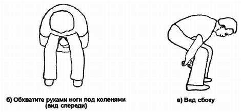 к) Обхватите руками ногу под коленом, стараясь свести локти вместе и глядя на пол