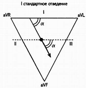 Мысленно поместим результирующий вектор возбуждения желудочков внутрь треугольника Эйнтховена. Угол, образованный направлением результирующего вектора и осью I стандартного отведения, и есть искомый угол альфа (α).