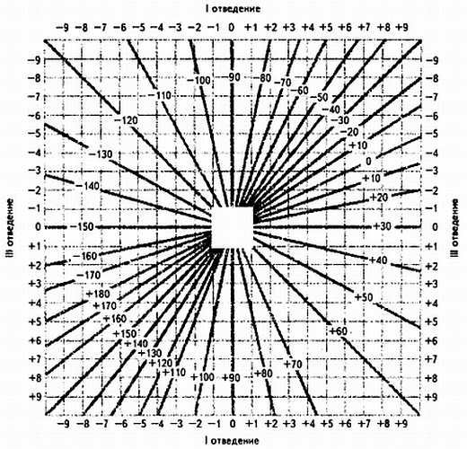 Далее, сопоставляя найденную алгебраическую сумму зубцов для I и III стандартных отведений, по таблице определяют значение угла альфа. В нашем случае он равен минус 70°.