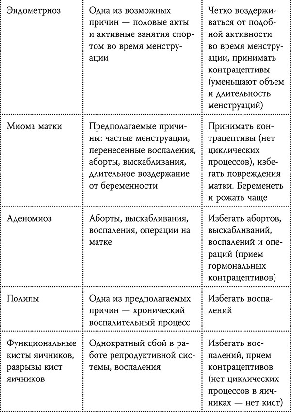 Женщин условно можно разделить на две группы: те, у которых с самого начала менструаций все нормально и нет никаких проблем с гинекологией, и те, у кого проблемы начинаются уже с подросткового периода, и они их решают на протяжении всего репродуктивного периода. Подавляющее большинство гинекологических проблем и заболеваний у женщин из первой группы – приобретенные, то есть их появление можно предотвратить. Ниже в таблице я представлю наглядный пример.