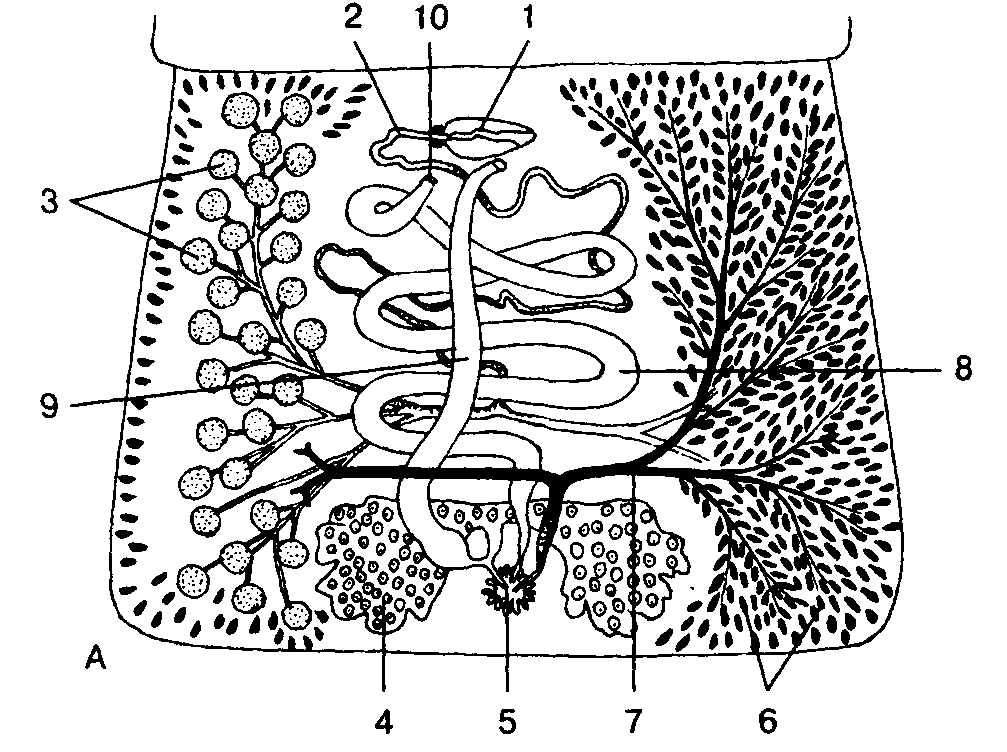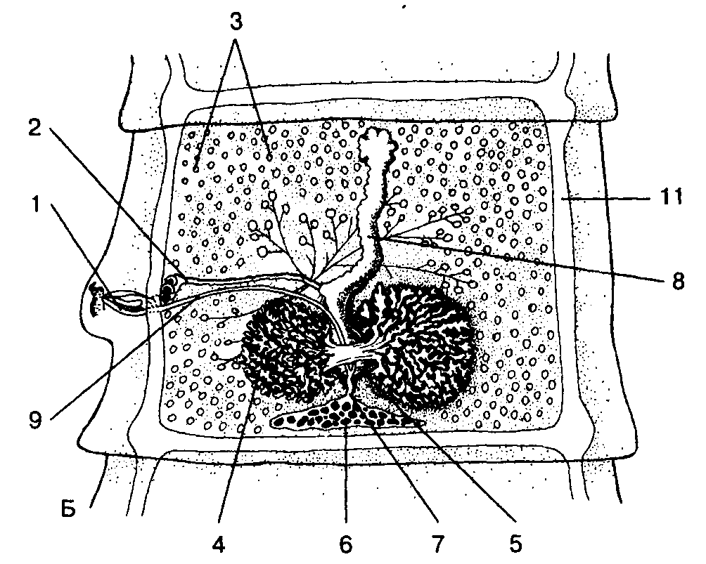 А – широкого лентеца; Б – бычьего цепня; 1 – совокупительный орган; 2 – семяпровод; 3 – семенники; 4 – яичник; 5 – оотип; 6 – желточники; 7 – желточный проток; 8 – матка; 9 – влагалище; 10 – отверстие , через которое выходят яйца (у цепня матка слепо замкнута); 11 – выделительный канал (у лентеца не показан)