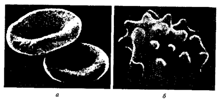 а — нормальные эритроциты в форме двояковогнутого диска; б — сморщенные эритроциты в гипертоническом солевом растворе