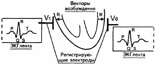 На рис. 89 схематически изображен миокард желудочков. Векторы возбуждения миокарда желудочков распространяются от эндокарда к эпикарду, т. е. они направлены на регистрирующие электроды и графически отобразятся на ЭКГ ленте как зубцы R (векторы меж желудочковой перегородки для упрощения понимания не рассматриваются).