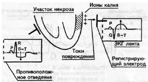 При инфаркте миокарда происходит гибель миокардиоцитов, внутриклеточные ионы калия выходят из погибшей клетки, накапливаются под эпикардом, образуя в зоне некроза «электрические токи повреждения», вектор которых направлен кнаружи. Эти токи повреждения существенно изменяют процессы реполяризации (S-Т и Т) в зоне некроза, что отображается на ЭКГ ленте. Регистрирующие электроды, расположенные как над областью инфаркта, так и противоположной, записывают эти токи повреждения, но каждый по-своему.