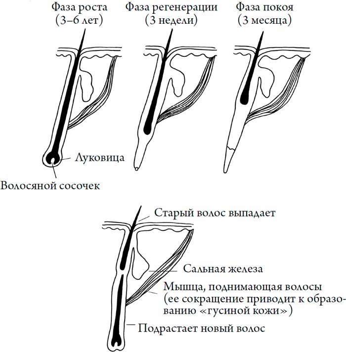 Волосы на голове растут со скоростью примерно 1 см в месяц в течение срока от трех до шести лет, после чего они достигают конца своего жизненного цикла, выпадают и дают место новым. У волос в бровях с их жизненным сроком приблизительно в четыре месяца самая короткая продолжительность жизни. Регулярный цикл поддерживается благодаря гормонам и нейромедиаторам: после продолжительной фазы роста наступает фаза регенерации, которая длится от одной до трех недель. Затем следует стадия покоя (три месяца), пока волос в какой-то момент наконец не покидает голову.