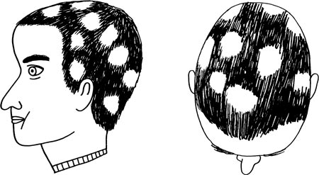 Круговое облысение – это особая форма потери волос. Само название подсказывает, как оно может выглядеть: волосы вылезают клоками; в волосяном покрове, в бровях, ресницах, в подмышечных впадинах и на лобке, даже в бороде видны круглые безволосые пятна. Иногда образуются очень большие проплешины, захватывающие область шеи и виски, а иногда люди теряют все волосы на голове и теле.