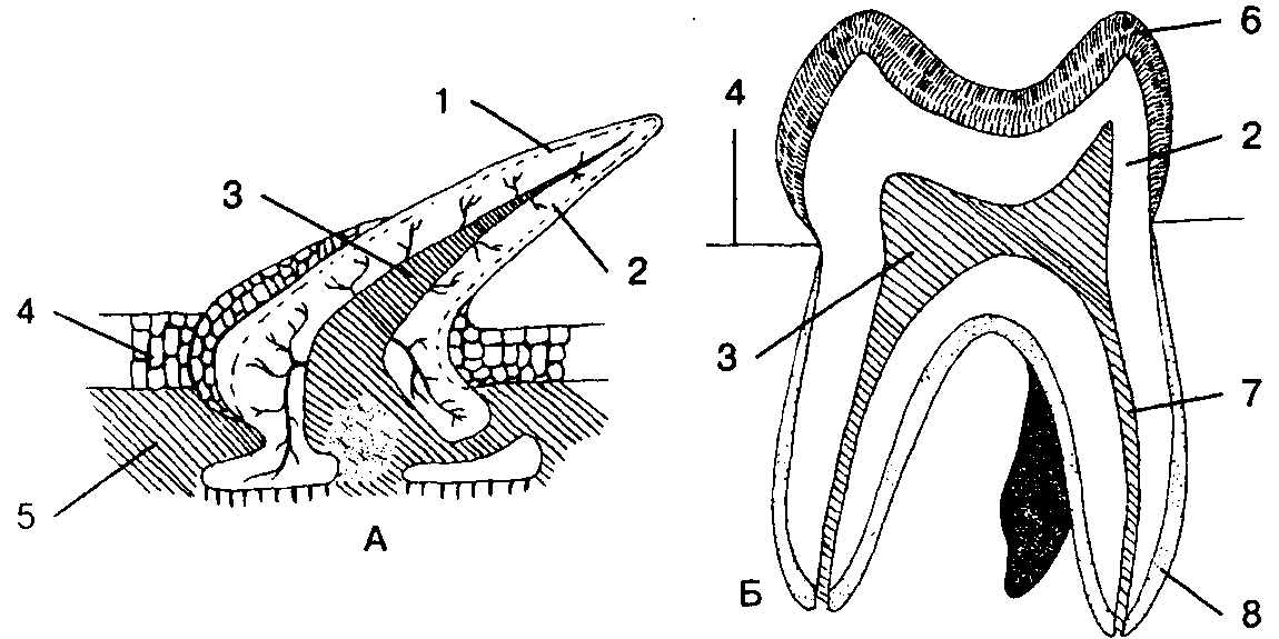 1 – эмалеподобное вещество; 2 – дентин; 3 – пульпарная полость; 4 – эпидермис; 5 – кориум; 6 – эмаль; 7 – канал корня; 8 – цемент