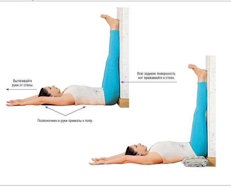 ? Надавите руками на внутреннюю сторону колен, приближая их к стене; не позволяйте тазу удаляться от стены, а весь позвоночник, особенно поясницу и крестец, удерживайте на полу. Это вариация Баддха Конасаны.