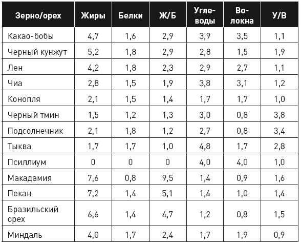 Содержание питательных веществ в орехах и семенах, разрешенных при ммт
