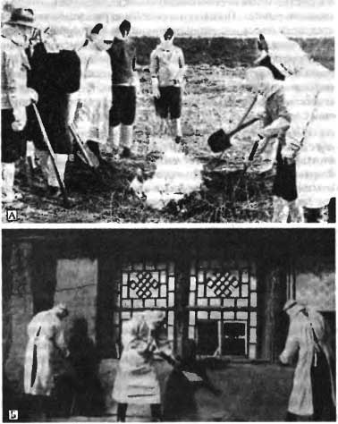Рис. 1.41 Ликвидация последствий бактериологических нападений в Северной Корее в 1952 г. А. Организованный женский отряд бонификаторов собирает и сжигает насекомых, сброшенных американскими самолетами. Б. Дезинфекция в городе после биологического нападения. Доклад… (1952)