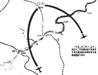 Рис. 1.42. Карта маршрута американских самолетов вторгшихся в воздушное пространство уезда Куаньдянь 12 марта 1952 г. Черным кружком обозначен населенный пункт, в к этором обнаружены зараженные насекомые. Доклад… (1952)