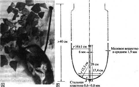 Контейнер «яичная скорлупа». 21 марта за чертой города Куаньдяня в провинции Ляодун местными жителями было найдено свыше 200 обломков контейнера, сделанного из какого-то известкового вещества, вместе с чашеобразной металлической пластинкой и металлическим стержнем, прикрепленным к центру ее вогнутой поверхности. Вблизи контейнера было обнаружено большое количество черных мух (Hylemyia spp.), пауков (Tarentula spp.) и перьев. Бактериологическое исследование показало, что все они заражены возбудителем сибирской язвы. Эти насекомые по своей экологии не должны были встречаться в данной местности в это время. Изучение обстоятельств обнаружения контейнера позволило Комиссии утверждать, что он был сброшен с американского самолета 12 марта. Металлические части и известковые кусочки были предметом тщательного анализа, проведенного в Институте современной физики и в Институте прикладной физики Академии наук Китая. Анализ выполнялся с целью установления первоначальной формы этой конструкции (рис. 1.42).