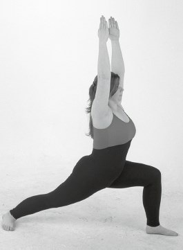 Обычный вариант Вирабхадрасаны I. Станьте, ноги – как на снимке. Поверните правую ступню наружу на 90 градусов, а левую – на 30 градусов. Отведите правое бедро назад, а левое – вперед так, чтобы торс повернулся на 90 градусов против часовой стрелки, а пупок находился на одной линии с большим пальцем левой ноги. Если вы не испытываете сильной боли в нижней части спины, поднимите руки вертикально так, чтобы бицепсы находились за ушами, а кисти рук были повернуты друг к другу. Если у вас сильная боль в нижней части спины, оставьте руки по бокам. Смотрите прямо перед собой, вытянувшись вверх, особенно тяните грудную клетку, предплечье и большие пальцы рук.