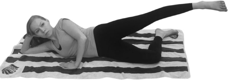 1. Лежа на боку поднимать прямую ногу вверх, нога и туловище на одной линии. От 5 до 10 повторов в 3 подхода (см. рис. 56).
