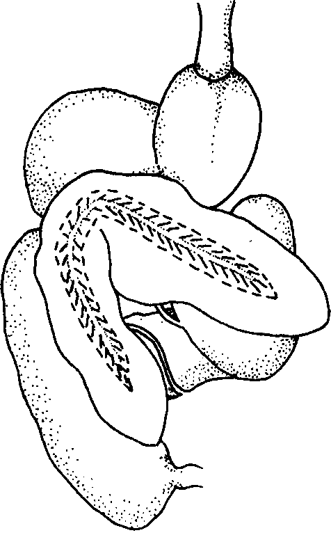Может, это и не печень, раз она впадает не в кишечник, всасывает пищу и вообще «ведет себя неправильно»? Оказывается, всё не так просто. Двенадцатиперстная кишка человека во время эмбриогенеза образуется из одного зародышевого листка – энтодермы, а наш желудок – из другого, из эктодермы. У моллюсков все происходит немного иначе. Родоначальницей средней кишки и желудка является энтодерма. То же самое происходит и у плеченогих, или брахиопод. Значит, проток печени «правильно» впадает в начало энтодермального отдела кишечника – в желудок. Так что расположена печень моллюсков на самом деле там же, где и у нас.