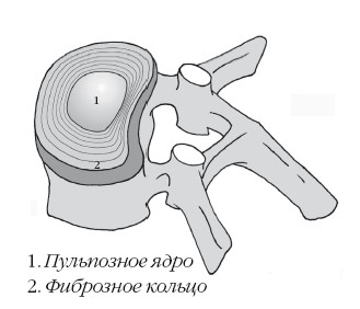 В межпозвоночном диске выделяют центральную часть, или студенистое ядро (1), приблизительно на 80 % состоящее из воды, и периферическую часть, или фиброзное кольцо (2), образованное концентрическими слоями волокнистой соединительной ткани наподобие луковицы.