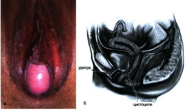 Рис. 18.2. Цистоцеле: а – дефект лобково–шеечной фасции; б – схема